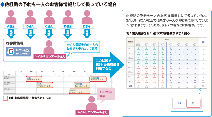 電話予約などの他経路の予約を1つのお客様情報で管理していると、集計・分析画面では1人のお客様が何回も来店しているように表示されます。他経路の予約を入れる際は、一人一人のお客様情報を登録してください。